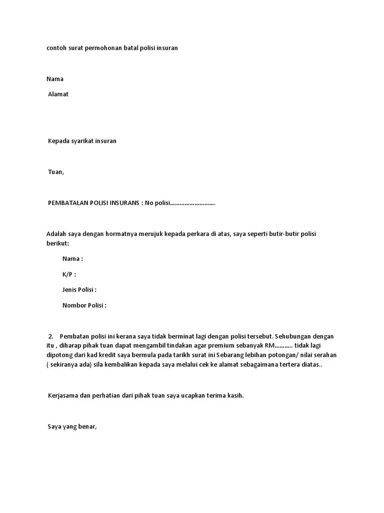 Contoh surat pembatalan polisi insurans zurich surat pembatalan polisi insurans. Text of surat pembatalan polisi insurans.